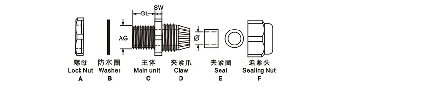特殊夾緊爪與密封件相扣之設計,配合迫緊頭裝配省時便利,夾緊電纜范圍大,抗拉力特強,可防水、防塵、防鹽、耐酸堿、酒精、油、脂及一般溶劑。